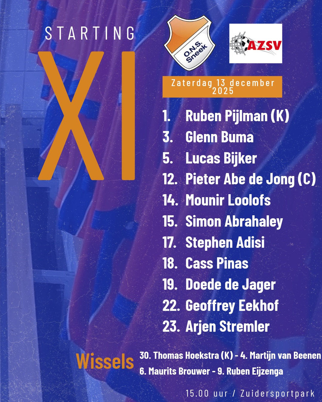 Naar aanleiding van zijn rode kaart vorige week op bezoek bij SVZW kreeg keeper Ruben Pijlman één wedstrijd schorsing opgelegd. Deze kon hij mooi ‘uitzitten’ bij het midweekse bekerduel in en tegen Berlikum (0-2), waardoor hij tegen AZSV weer onder de lat kon plaatsnemen. Verder viel het op dat Simon Abrahaley en Doede de Jager in de basis mochten beginnen. Zij deden dit ten faveure van Maurits Brouwer en Ruben Eijzenga. Hierdoor stond Arjen Stremler in de punt van de aanval geposteerd.