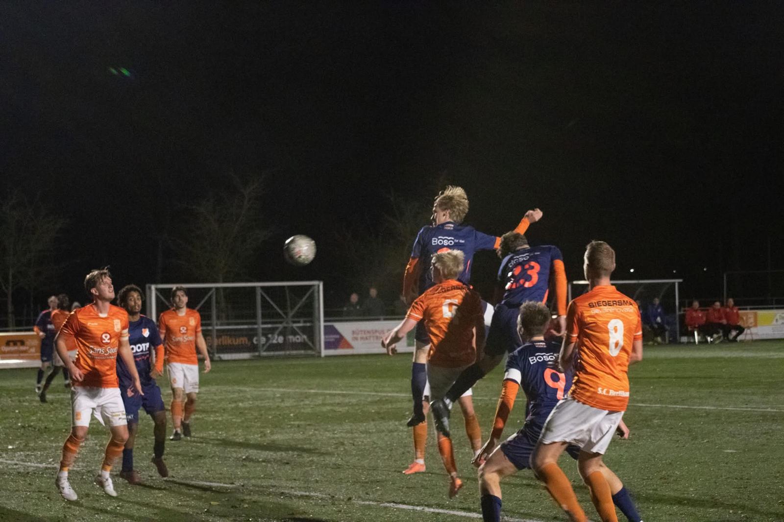 In een sfeervol decor met het nodige vuurwerk betraden de beide teams het veld. In bekerduels tegen tegenstanders die in de competitie op een lager niveau acteren, is het over het algemeen zaak om vroeg op voorsprong te komen. Waar dit in Marum uitstekend lukte met een treffer in de tweede minuut, had ONS het in Berlikum lastig om tot kansen te komen. De thuisploeg stond bij balbezit voor ONS zeer compact, waardoor de ruimtes erg klein waren. Verreweg het meeste balbezit was wel voor ONS en dit resulteerde in een handvol kansen op de kunstgrasmat, waar de wind een voorname rol speelde. Kopballen van Glenn Buma en Cass Pinas gingen net naast het vijandelijke doel. Daarnaast belandde een corner van Geoffrey Eekhof rechtstreeks op de paal.